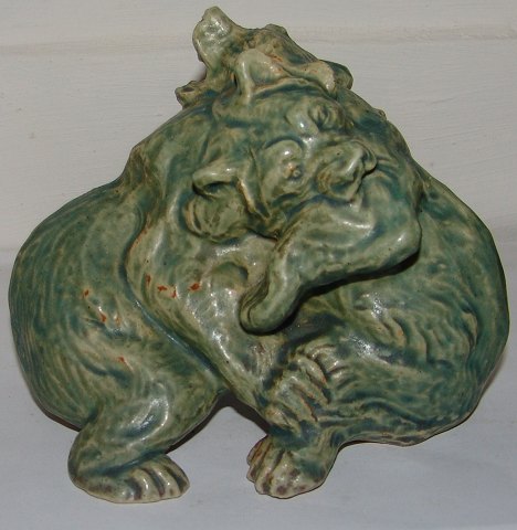 Royal Copenhagen Stoneware Bear Figurines designed by Knud Kyhn. This made in 1919. Done in a rare green glaze. Measures 17cm x 12cm og er i god stand.