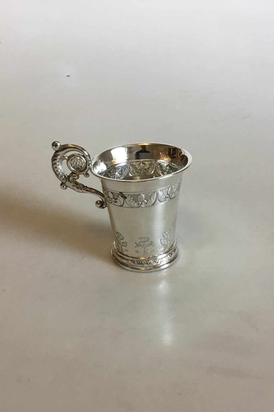 Little Cup in Silver with handle. Measures 7.8 cm / 3 5/64 in. Weighs 49 g / 1.75 oz.