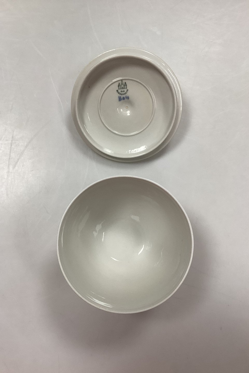 Bing and Grøndahl Hans Tegner Bonbonniere with Grapes. White with grape vines in gold and purple grapes in overglaze. Signed HT/Hans Tegner, LL/Lotte Lindahl and EK/Emma Kongsbøll.