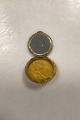 Art Deco Pillbox with Mirror. Presumably Bakelite in yellow marbling. Motif with woman in yellow dress on a background of silver glitter..