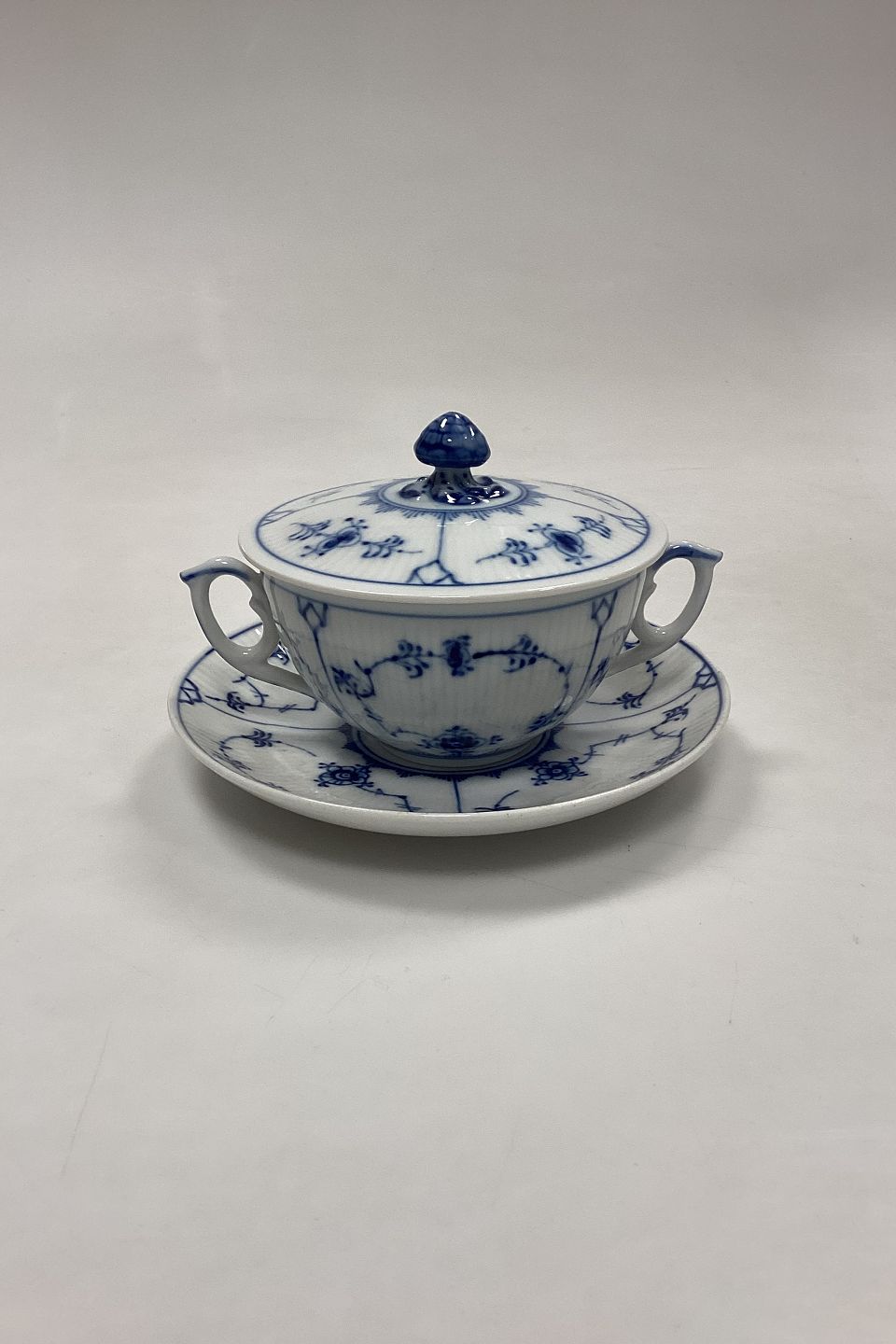 Royal Copenhagen Blue Fluted Plain Bouillon Cup with Saucer No. 2199. Measurements: Cup dia. 11 cm / 4.33 in. Saucer 16.3 cm / 6.42 in. 3rd Quality.