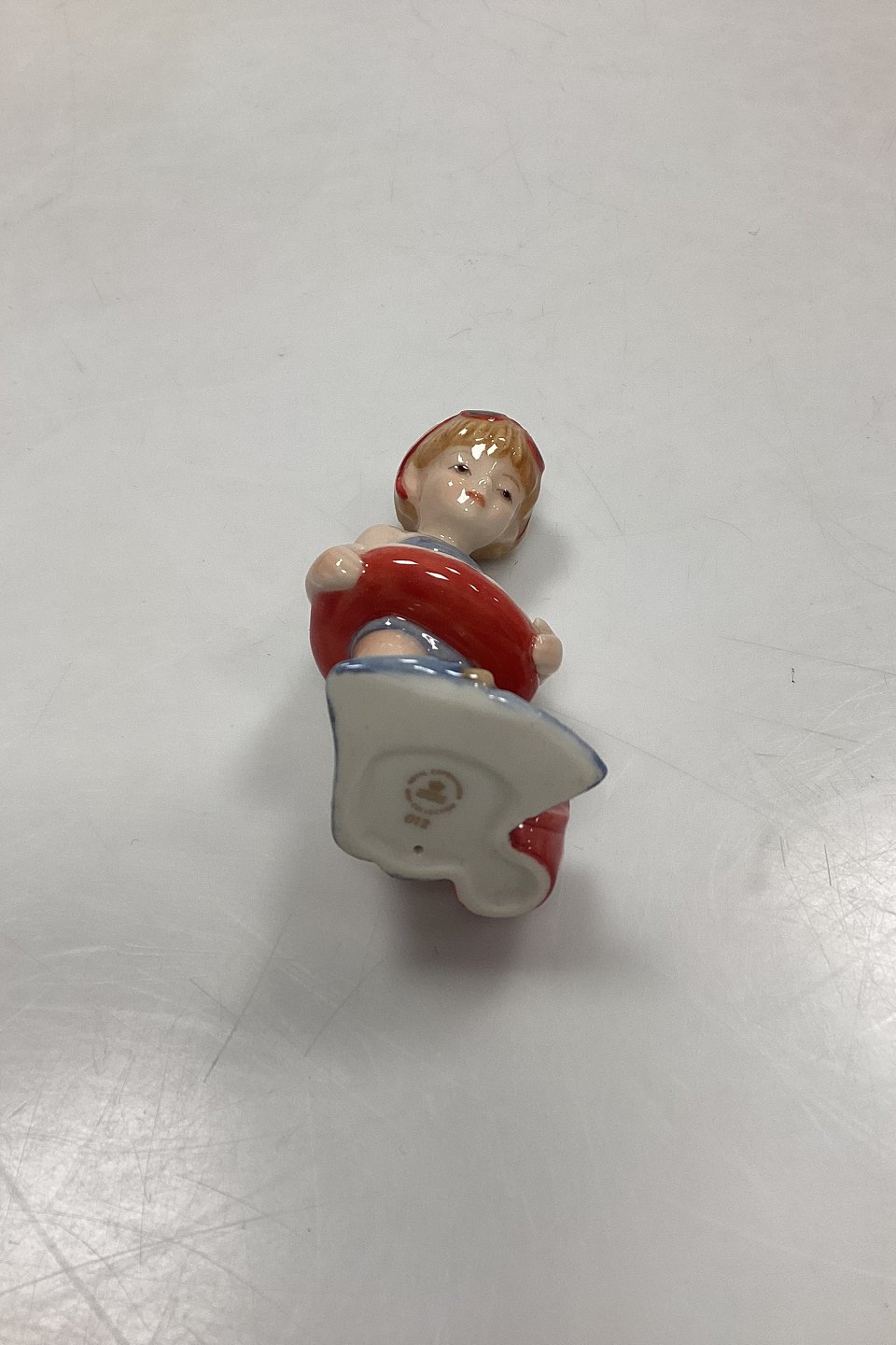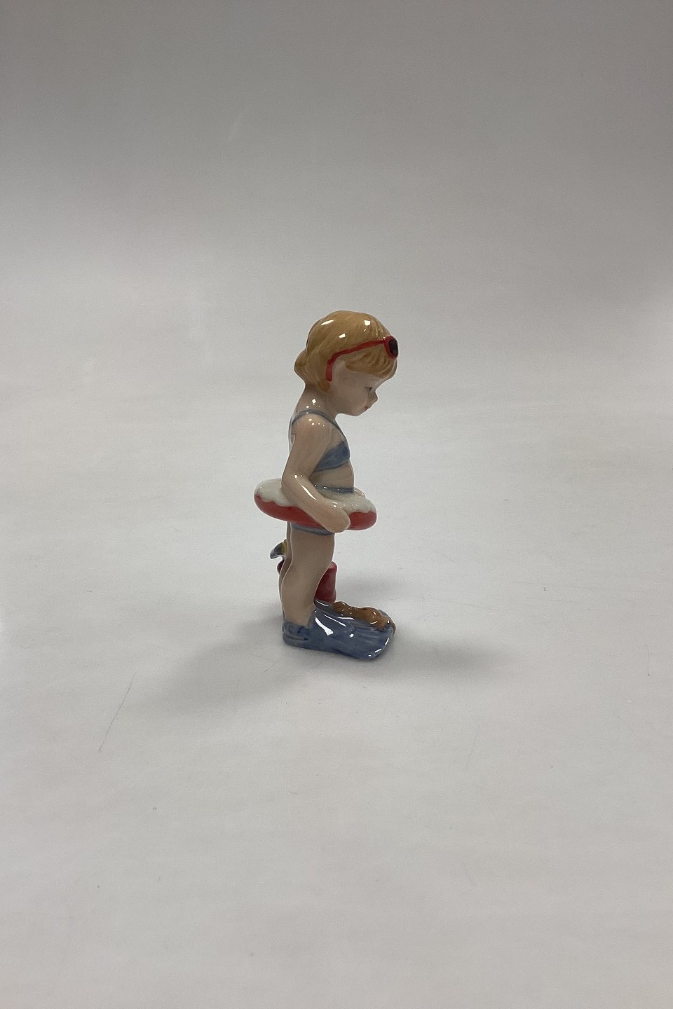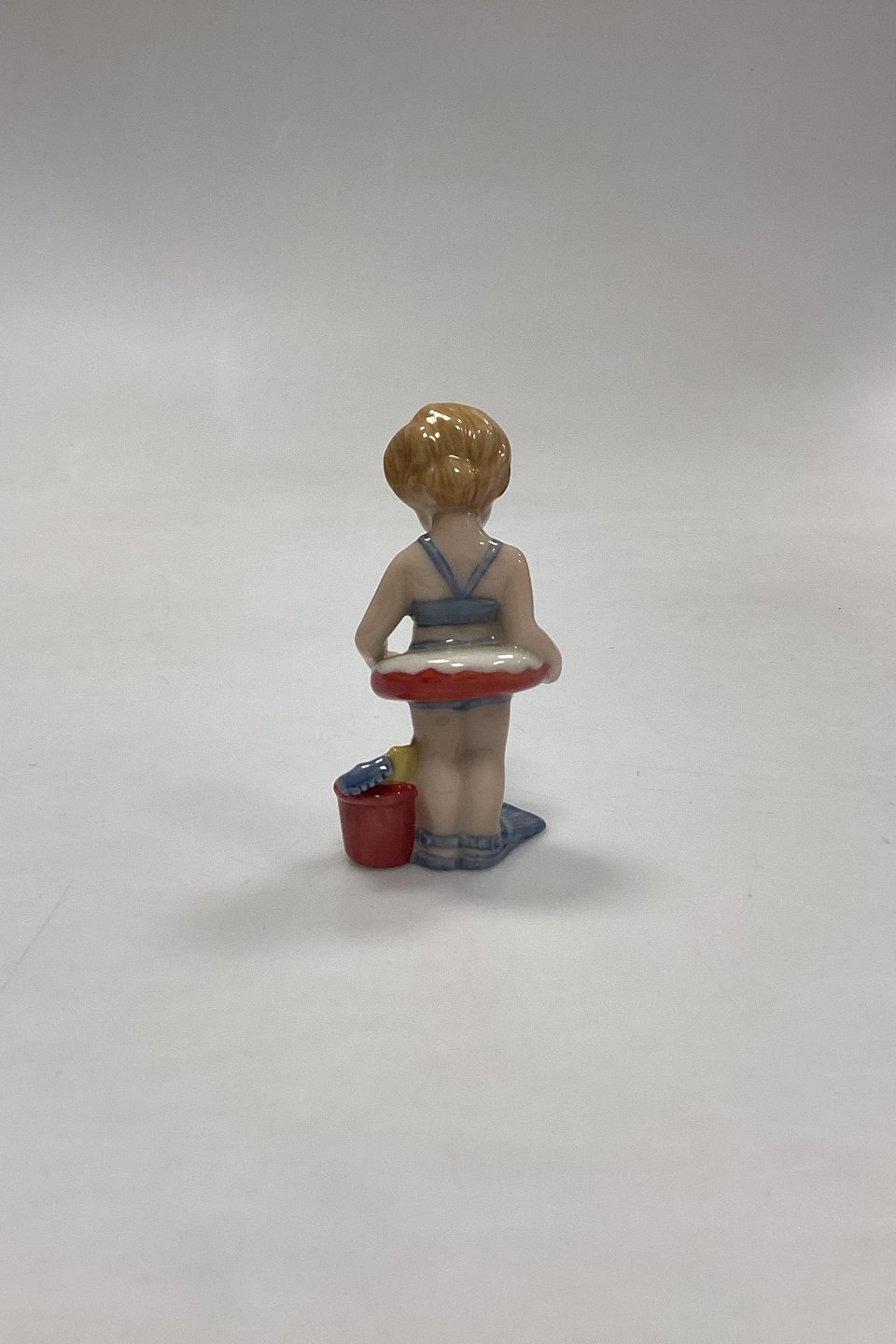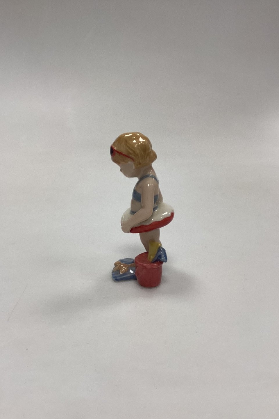 Royal Copenhagen Mini Collection Figurine Toddler - Christina No. 012. Girl with swimming ring, bucket and flippers. Designed by Sven Vestergaard.