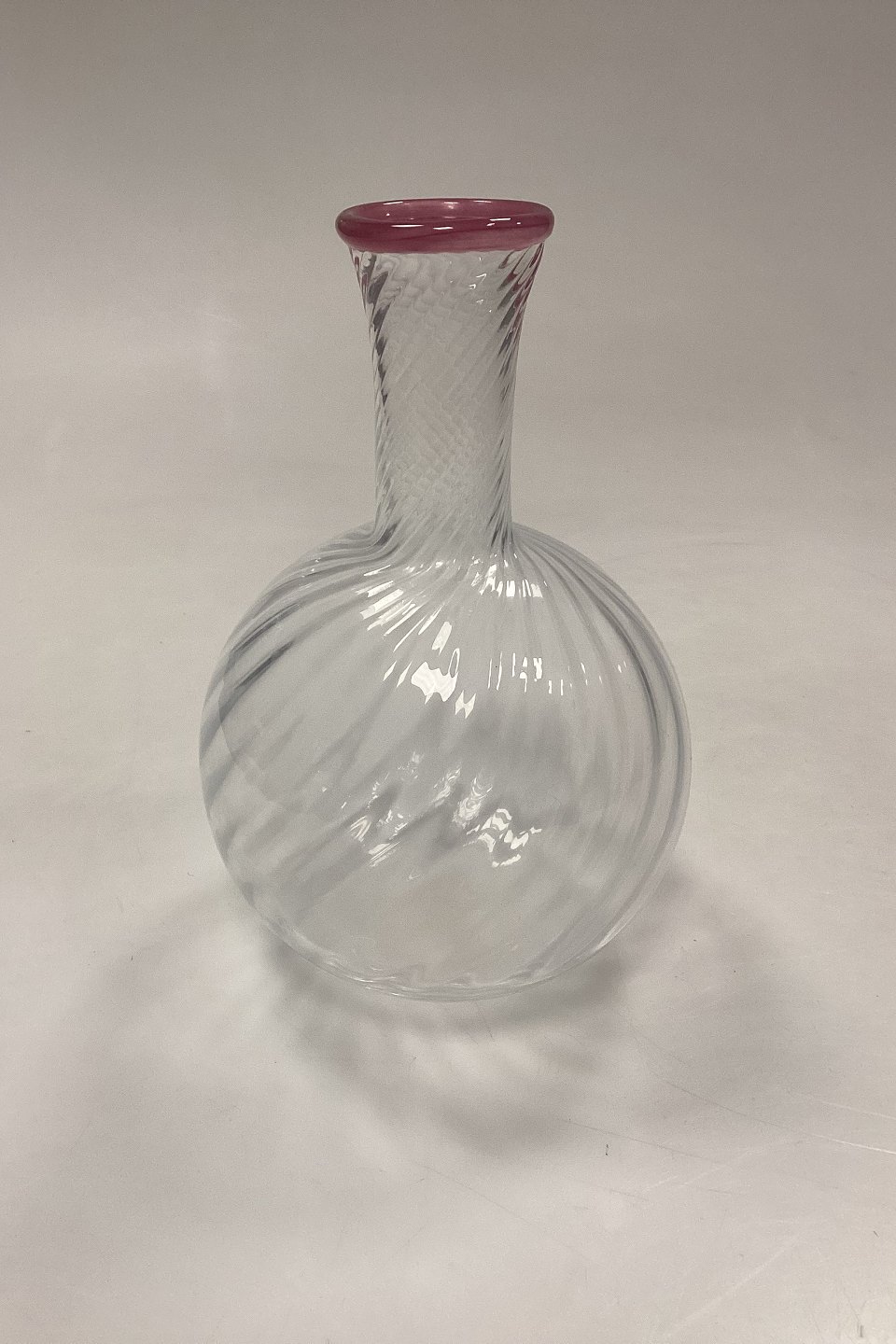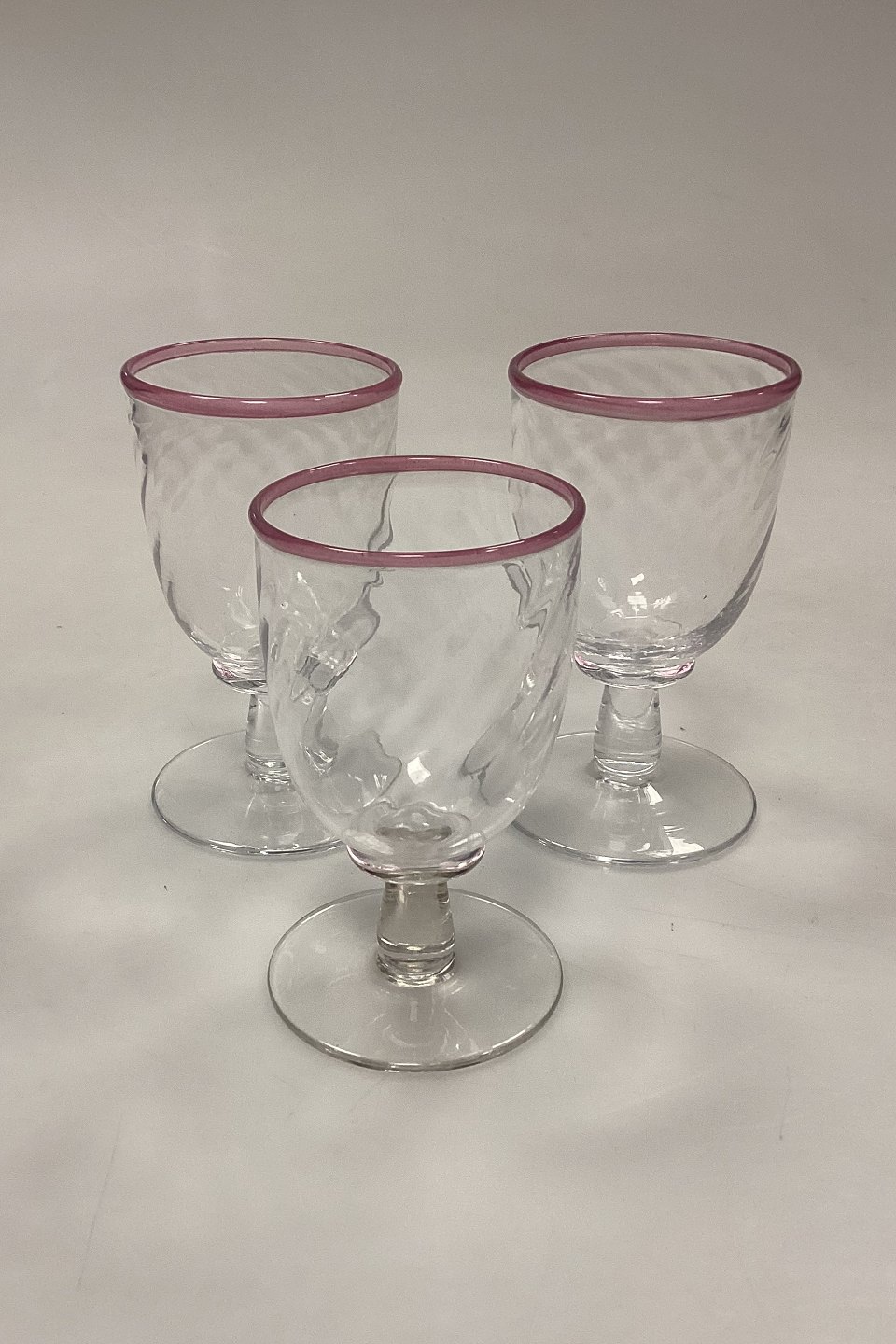 Large set of handmade glasses of 24 pieces. Clear glass with twisted optics and pink rim.