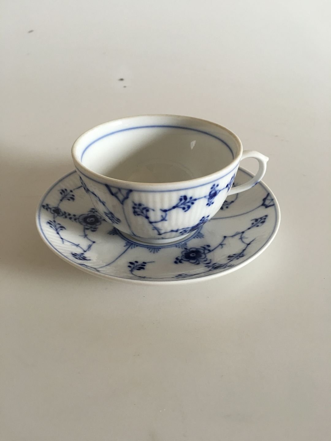 Royal Copenhagen Blue Fluted Plain Tea Cup and Saucer No 465. Measures 8.3 cm / 3 17/64 in.