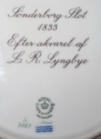 Royal Copenhagen Flora Danica Topografical motif No 3553. Inscription says "Sønderborg Castle 1833 after akvarel by L. R. Lyngbye. In perfect shape and measures 25,5cm.