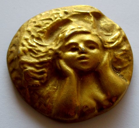 Royal Copenhagen Porcelain Art Nouveau Girl in Gold. Can be made into a brooch. Measures 3,8cm and is in good condition. Minimal wear on her noose.