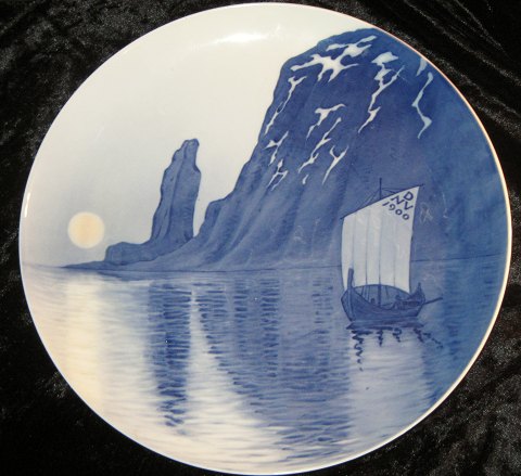 Norwegian mountain-side and fjord with Viking ship under sail. Inscription: D.N. V. (Danish-Norwegian friendship association) and the year 1900. Designed by Arnold Krog. 50 copies. 11”.