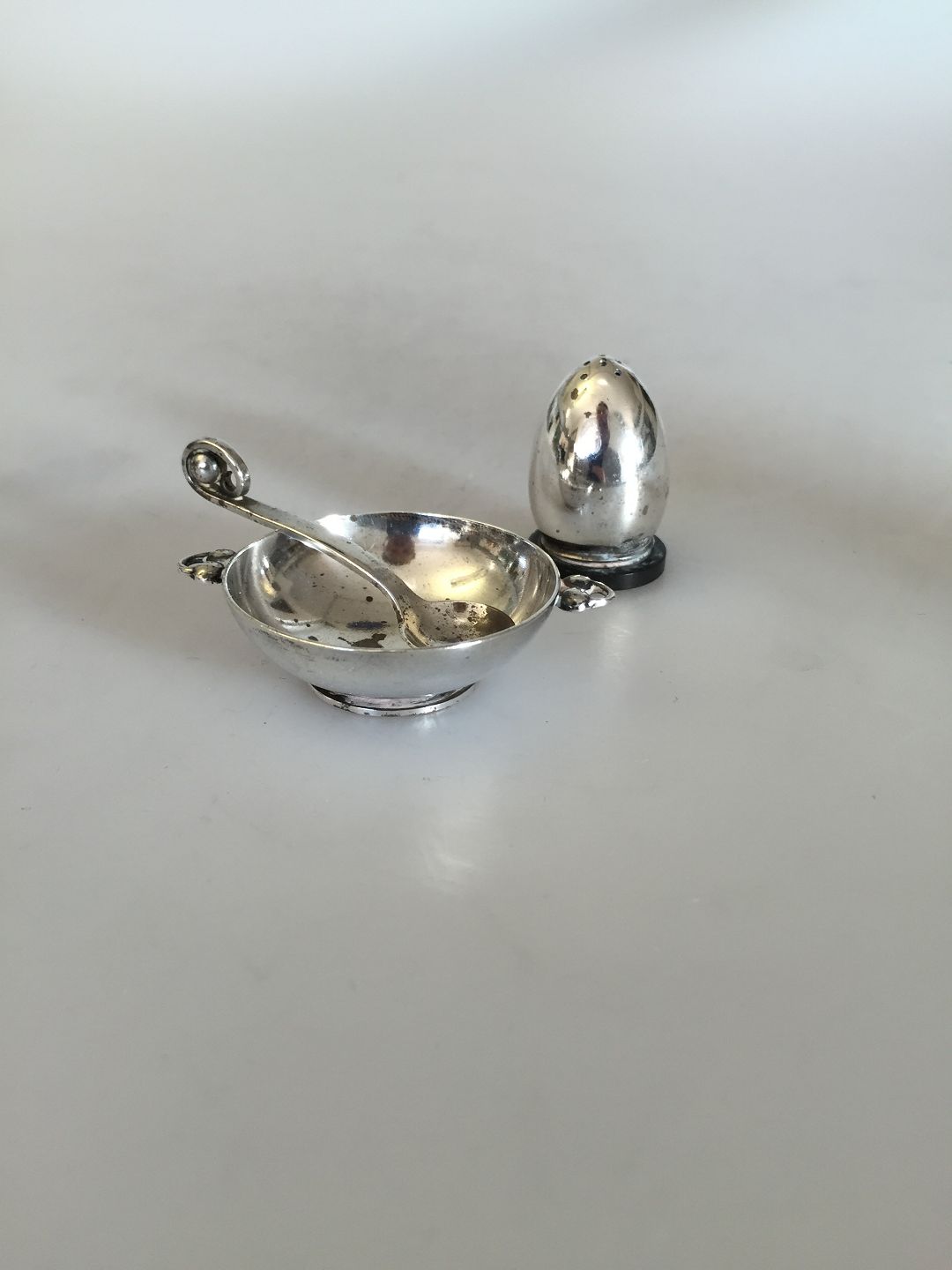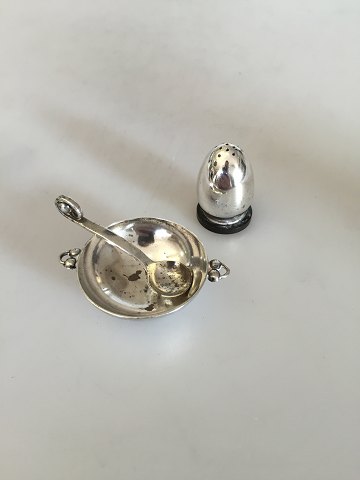 Evald Nielsen Salt dish with spoon and Pepper shaker in Sterling Silver and 830. Dish measures 5,5cm and shaker 3,1cm high. Is in good condition.