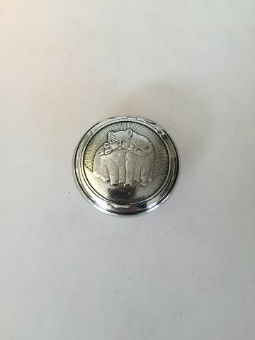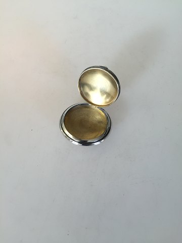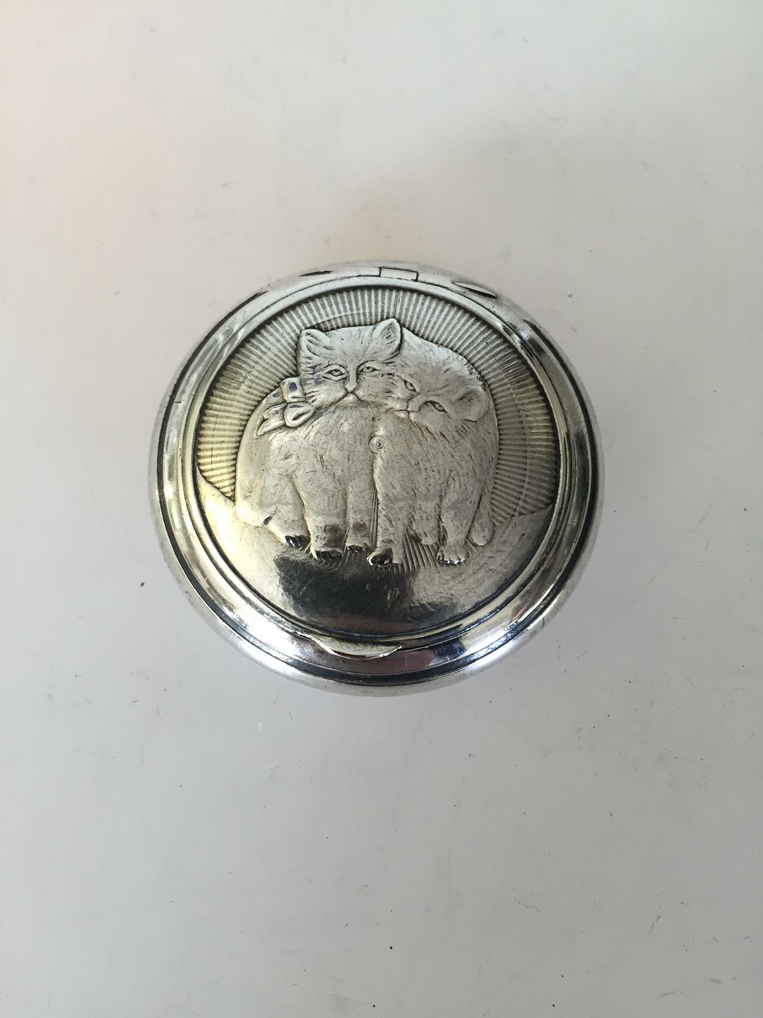 Pill and Snuff box in Silver with Cat motif. Measures 5,2cm dia. Gilded inside. Silver mark is 800 and silversmithy mark, which we can not make out. In good condition. With cat motif on the front and the back.