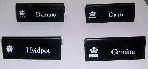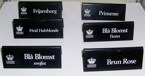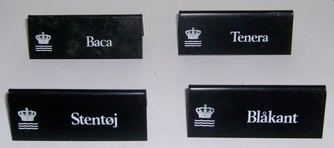 Royal Copenhagen Advertising Signs for Dinnerware Patterns. Done in plastic and measures 10,5cm x 4,2cm.