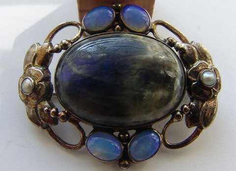 Georg Jensen 826 Silver Brooch with Opal, Perls and Moonstones No 78 from 1908-1914. Measures 5cm. Condition is good, but a silver pearl is dented at the end of the moonstones. One moonstone has a crack. But all in all, a nice original rare piece of Georg Jensen.