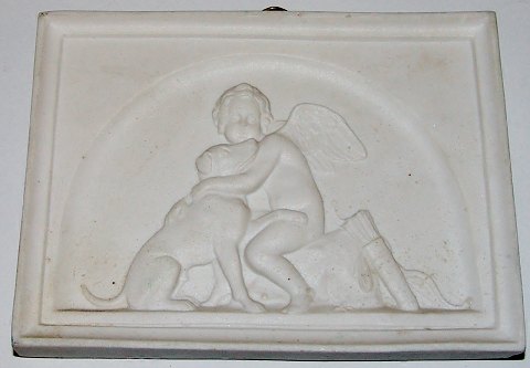 Bing & Grøndahl Bisque Plate "Amor petting his faithful dog" No 72. Copy from 1855 after Thorvaldsens original from Rom 1831. Measures 13 x 9,5cm (5.11 x 3.74 inch)