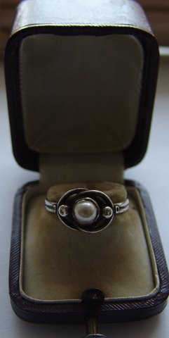 Georg Jensen Sterling Silver ring with pearl No 5. Ring is in good condition, but pearl seems to have been drill in its earlier life. Ring from 1933-1944. Size is 17mm. Size 52.