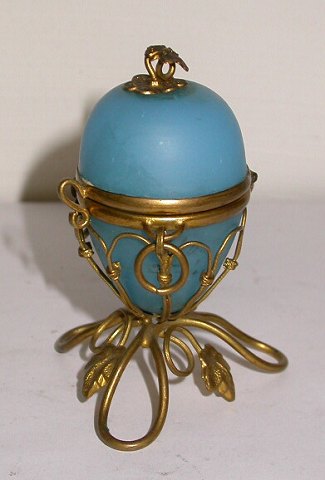 Small blue opal glass egg in metal holder. A little surprice inside - a small doll. 7 cm high .