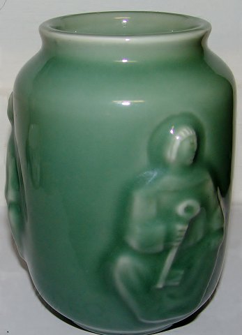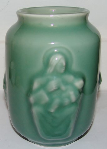 Royal Copenhagen Stoneware vase with Celedon Glaze by Jais Nielsen "Maria with Child". Measures 15,5cm and in good condition.
