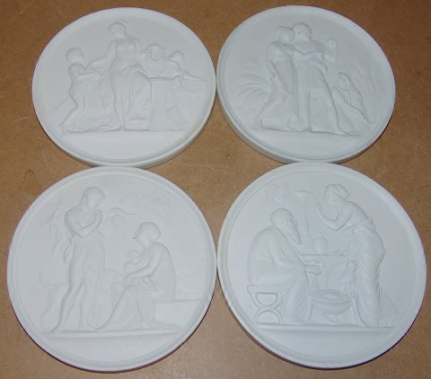 Set of Bing & Grøndahl Bisque Plates Spring, Summer, Fall and Winter No 116, No 117, No 118, No 119. Copy from Thorvaldsens original from Rom 1836. Measures 14,5cm. Old edition.