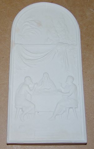 Royal Copenhagen Biscuit Plate Kristus in Emaus No 114. Copy by Christian Christensen in 1845 from Thorvaldsens original from 1818. Measures 18cm x 9cm(7.08 x 3.54 inch). Has two small chips on the rim. One on the bottom rim and the other on the left side.
