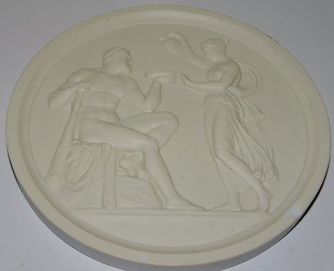 Bing & Grondahl Bisque Plate Herkules receives the drink of Iternal life from Hebe No 108. Copy after Thorvaldsens original from Rom in 1808. Measures 15,3cm. Has a chip 4 and 6 o'clock.