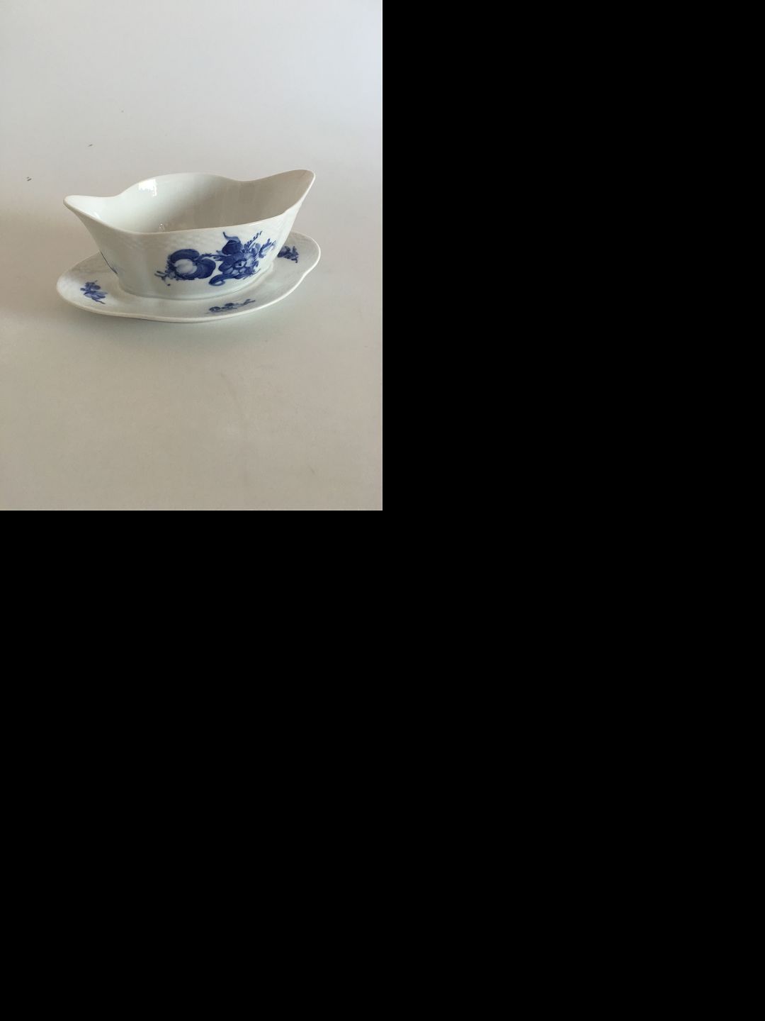 Royal Copenhagen Blue Flower Braided Sauce Boat with attached underplate No. 8159. Measures 23 cm / 9 1/16 in. and is in good condition.
