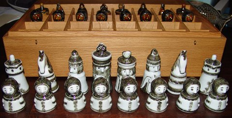Very few chess set has been made by Royal Copenhagen and Bing & Grondahl. Siegfriend Wagner og Kai Nielsen designed a chess set each. If you are interested in any of those chess sets, you can contact us, as we can help you with those as well.