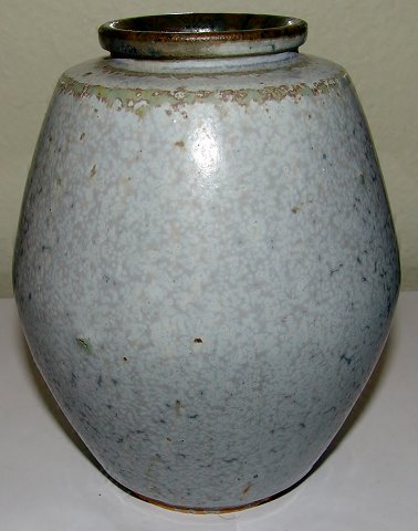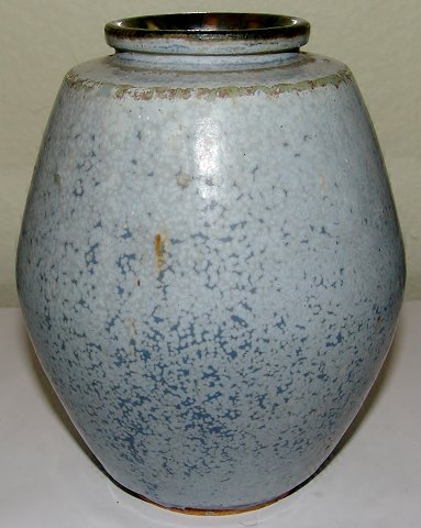 Arne Bang Stoneware Vase from Holmegaard No 35. Measures 17,5cm x 13cm. Is in good condition, but does have some fleabite chips on the bottom rim.