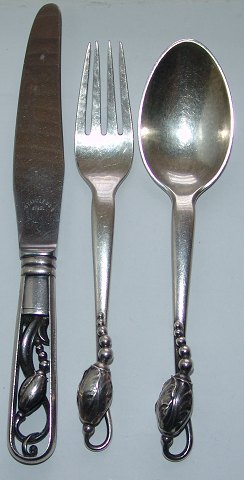 Georg Jensen Blossom Sterling Silver 3 Piece Flatware Sæt from 1933-1944. Knife measures 19,8cm, fork 17cm and spoon 17,5cm. In good condition.