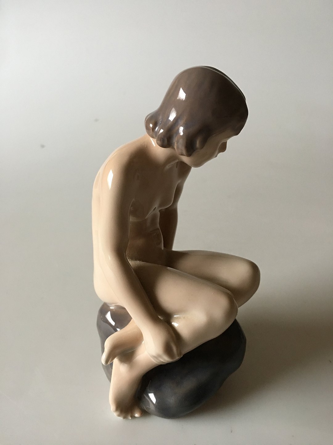 Royal Copenhagen Figurine Girl on Stone No. 4027. Designed by Ada Bonfils. Measures 15 cm / 5.90 in. and is in good condition.