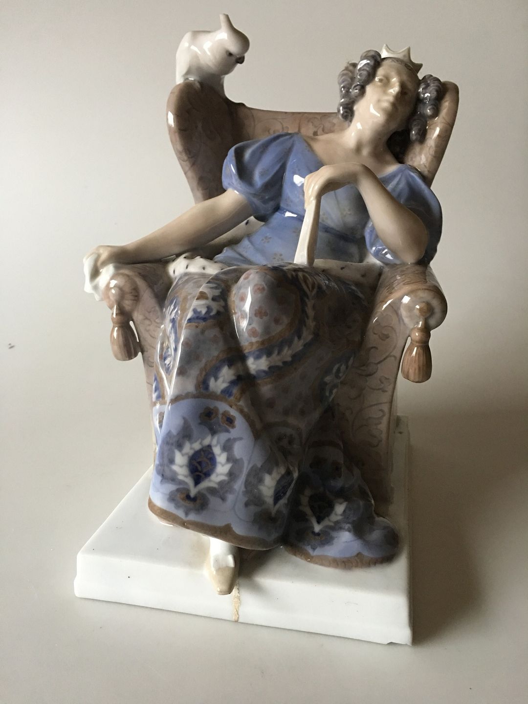 Royal Copenhagen Figurine Queen No 1494. Measures 25 cm. Designed by Christian Thomsen. Has a repairment in the middle underneath the queens foot. Furthermore the parrot has two chips, and there is a chip in the one corner of the foot.