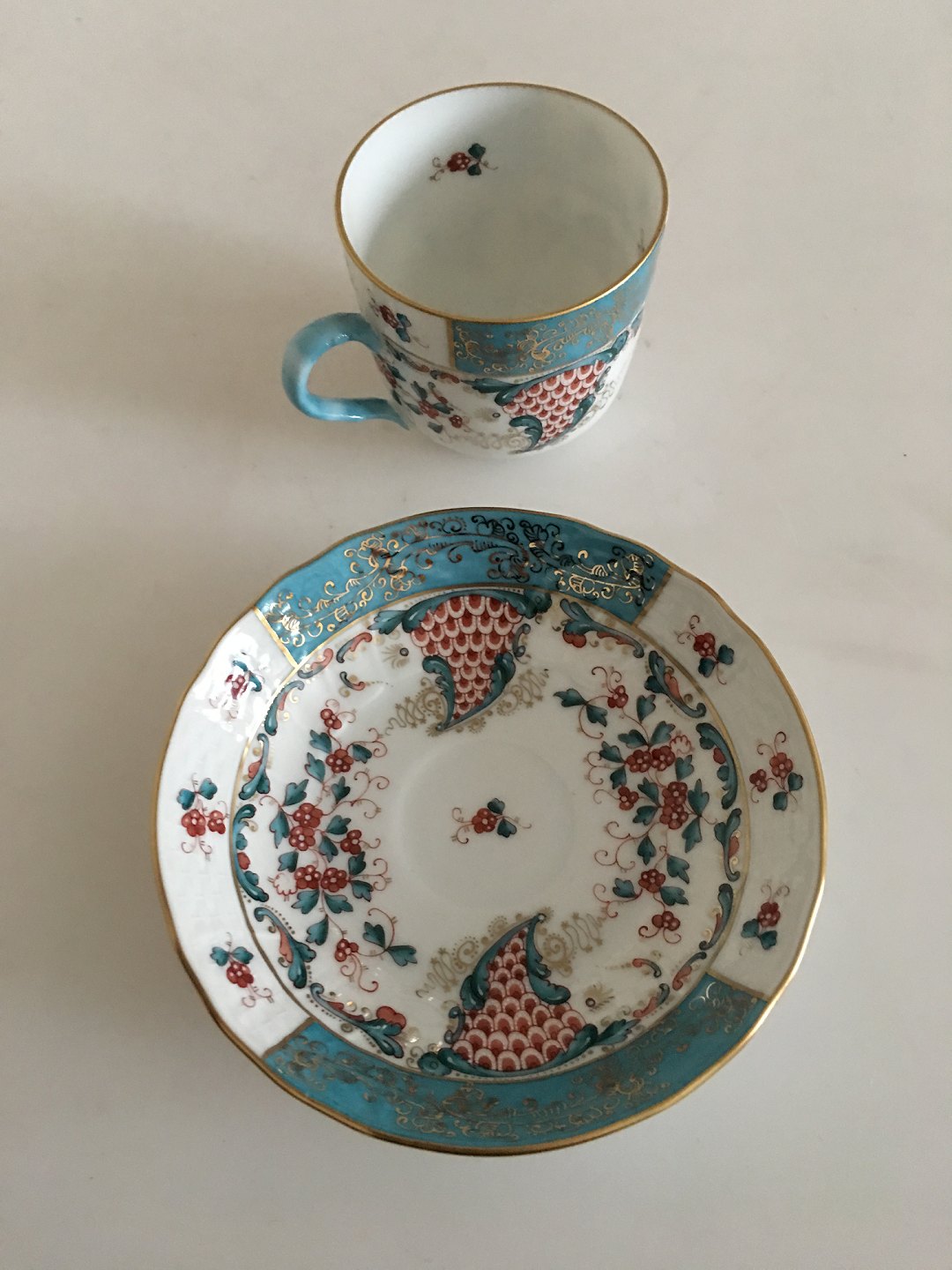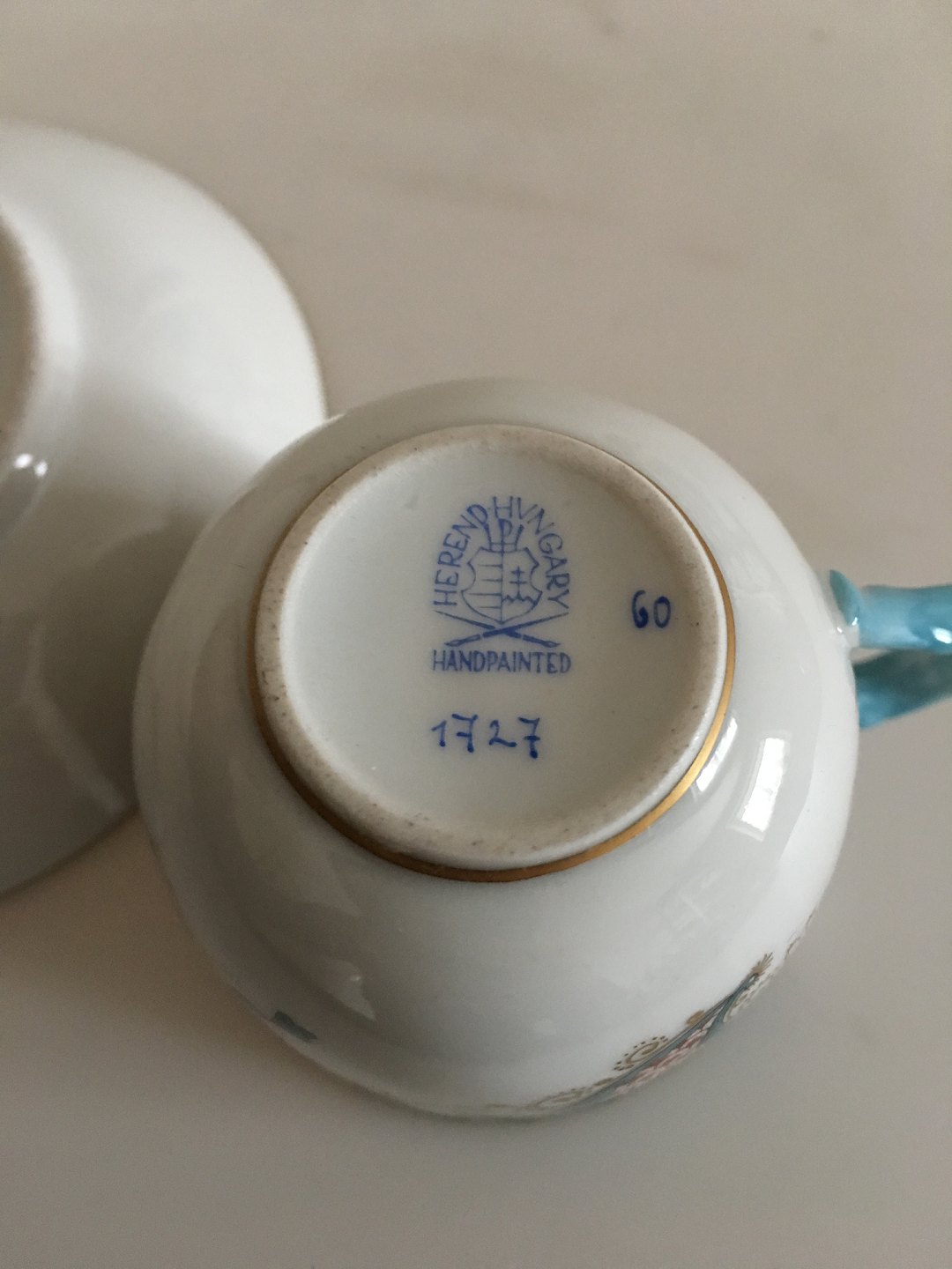 Herend Cornucopia (TCA) Coffee Cup (Mocca) and Saucer, Hungary No 1727. Cup measures 6 x 6 cm (2 23/64") Hungarian vintage Herend porcelain Coffee Cup and saucer. Hand painted with one of Herend's most magnificent pattern "Tupini, corne d'adordance" (called Cornucopia pattern in the USA) and 24K yellow gold accent. First class Herend trademark is on the bottom. Made in 1980s. Measures: cup 2 1/3" dia, saucer 5 1/8". * * * Condition: Brand New, comes from closed out store. Excellent without any damage or repair.