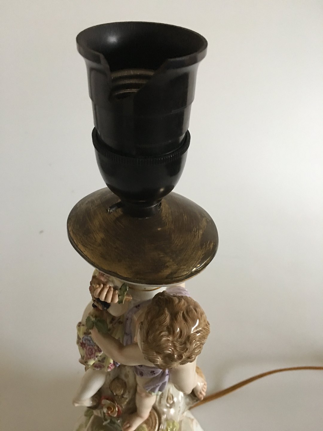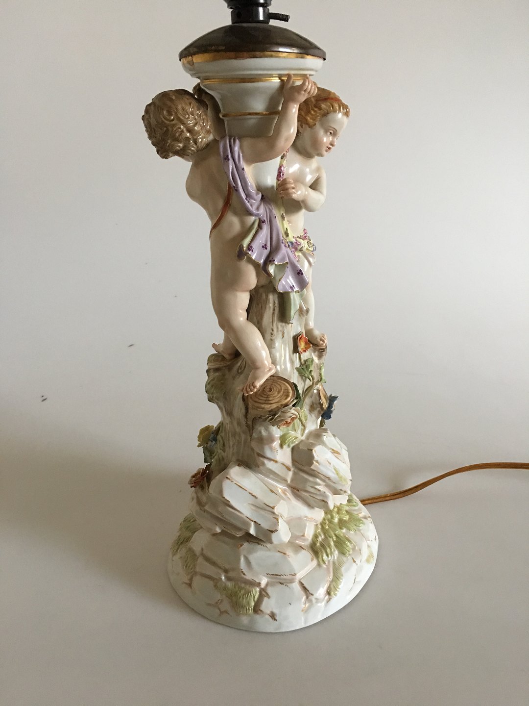 Meissen Lamp with Figurines. Measures 29cm high to the start of the mounting. Has a few chips here and there on the flowers.