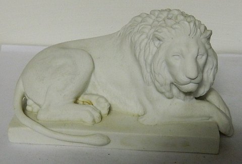 Bertel Thorvaldsen: Royal Copenhagen figure of lying lion in bisquit .A few small cuts are seen on the corner of the plinth at the end by the tail of the lion. Measures: 6½ cm high. Base measure 6½ x 12½ cm