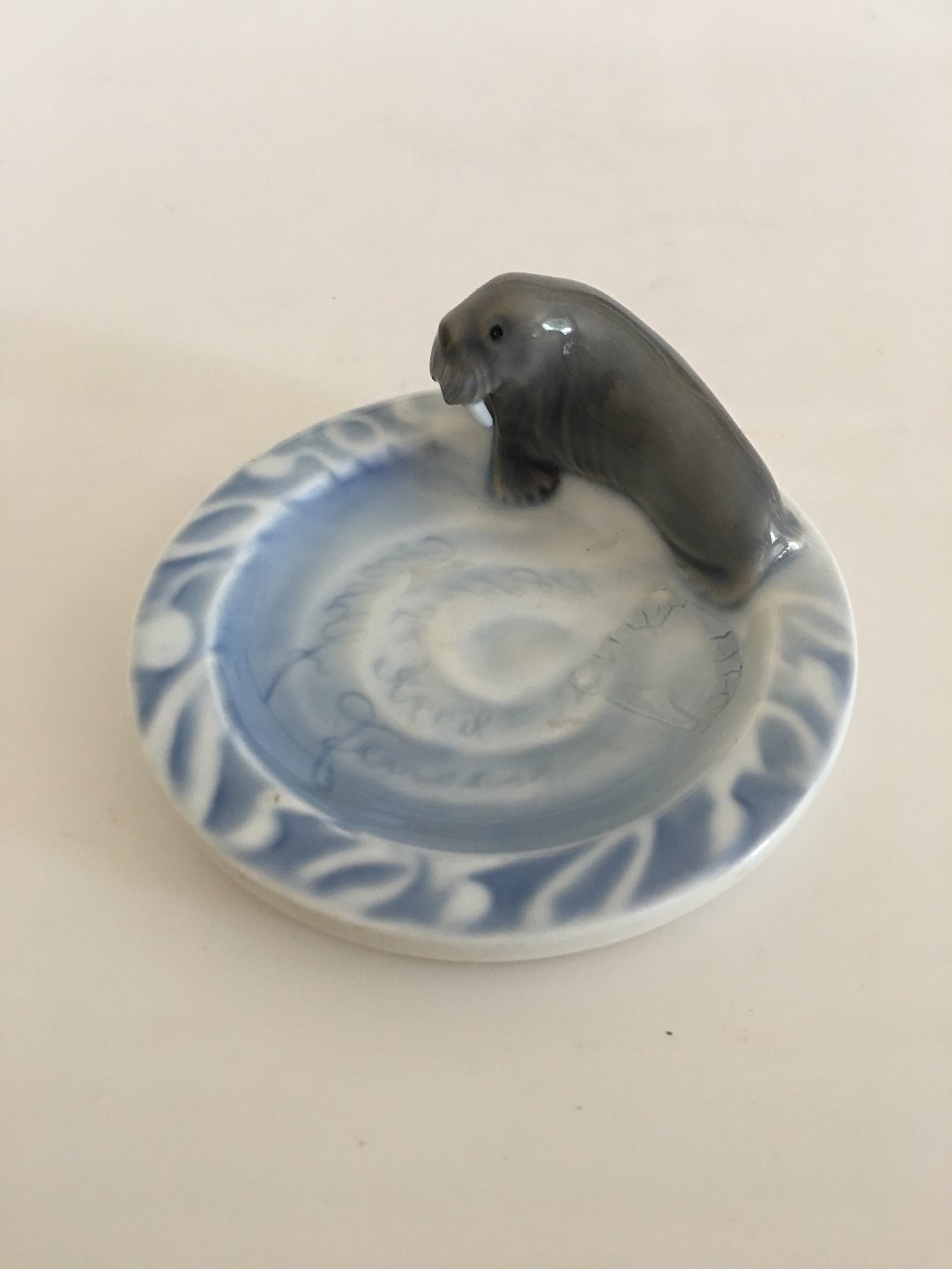 Bing & Grondahl Art Nouveau Ashtray with Whaleross. Measures 12cm. Difficult to read the inscription, but something with Rudolf Jensen 1899 24 Aril.... The piece has a burn mistake.