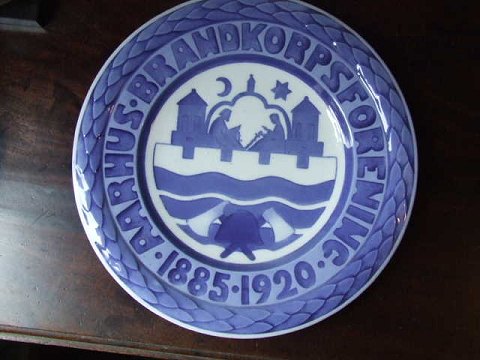 The city arms of Aarhus and inscription: AARHUS BRANDKORPSFORENING (Aarhus Fire brigade association) 1885-1920. Comm. on occasion of the 35th anniversary. Designed by Ellinor Selchau. 367 copies. 9".