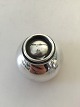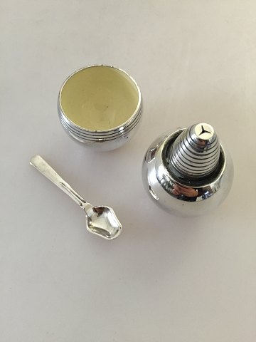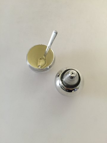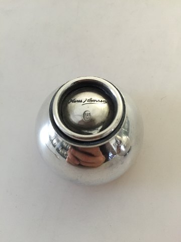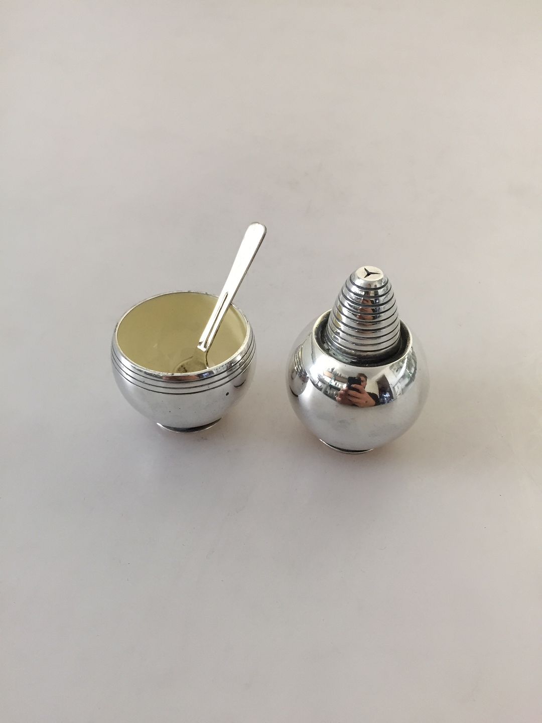 Hans Hansen Sterling Silver Saltdish and Peppershaker. Peppershaker measures 5,5cm high and saltdish is 4cm wide with yellow enamel. In good condition.