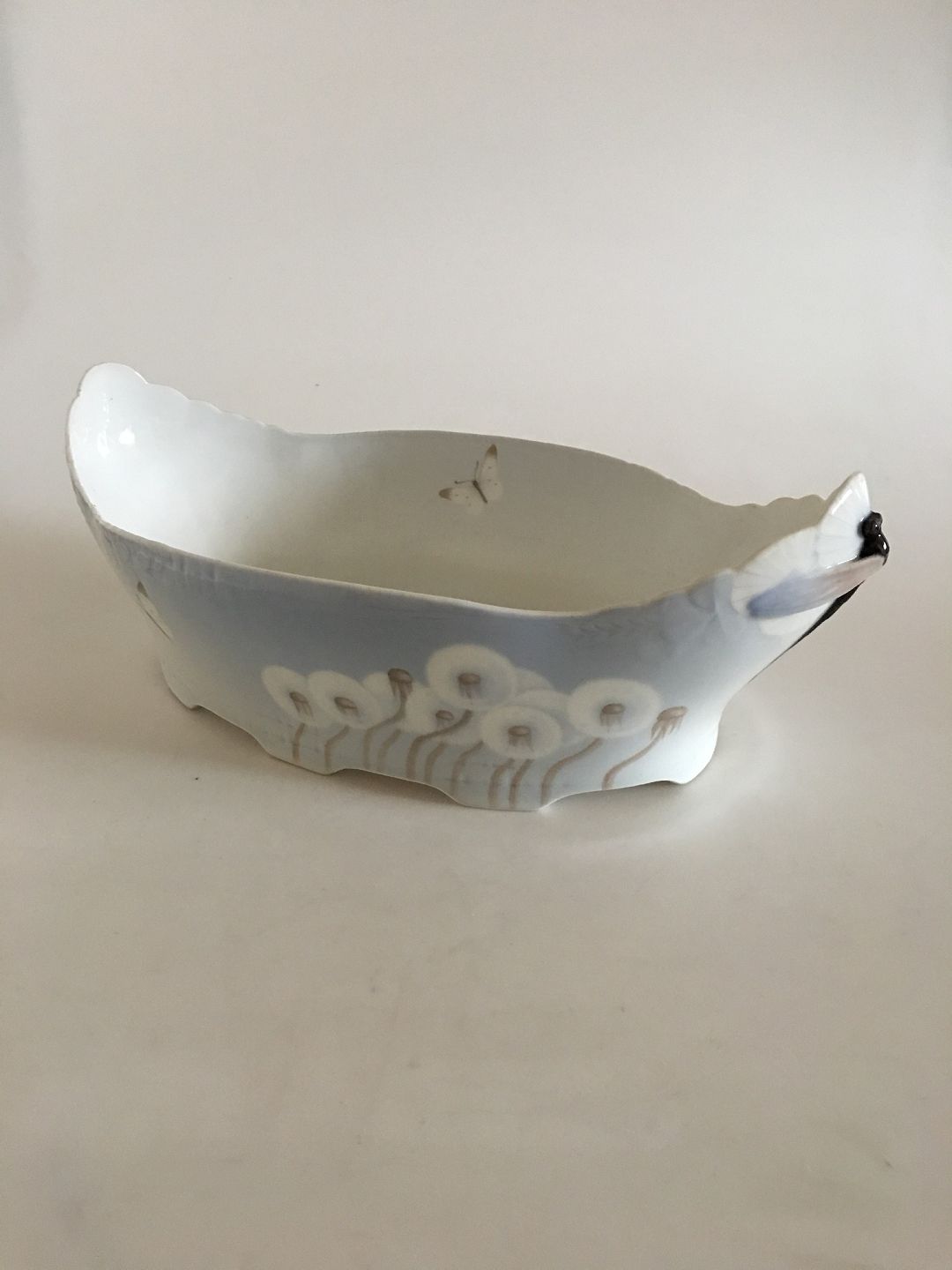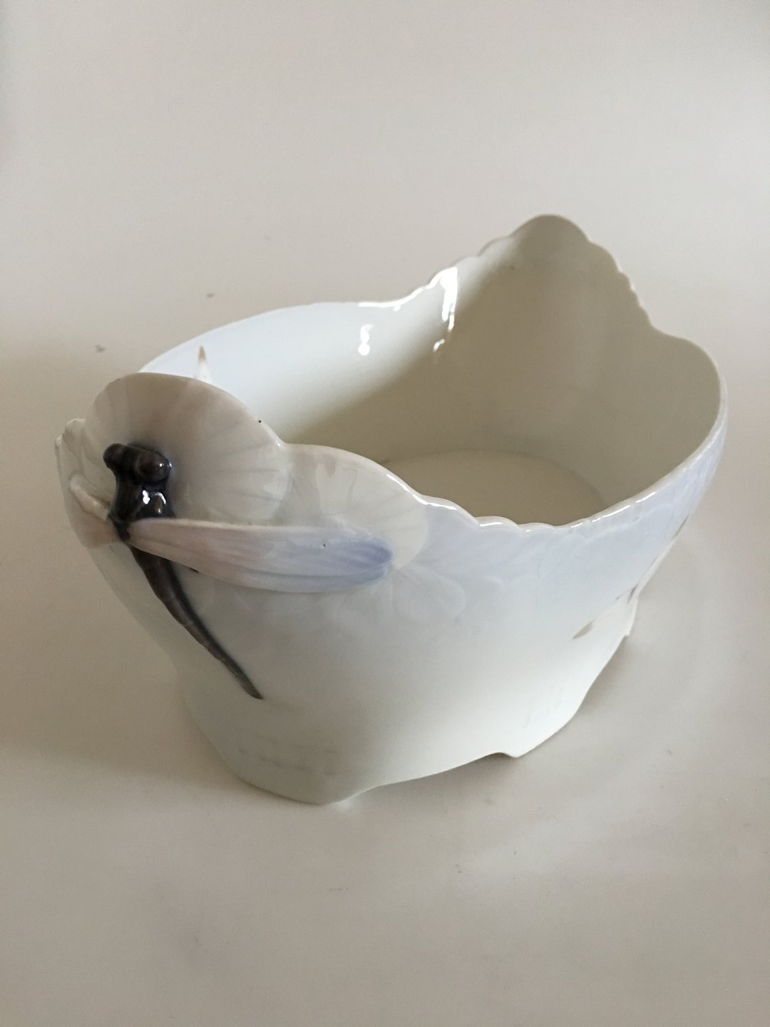 Royal Copenhagen. Art Nouveau porcelain jardinière, No. 1065/712. Decorated with relief, painted with butterflies, dandelions, and dragon flies. Designed by Arnold Krog 1899 for the Marguerite service, which was shown for first time at the Paris World Exhibition in 1900, the culmination of Art Nouveau. c. 1900. L. 41.5 cm.