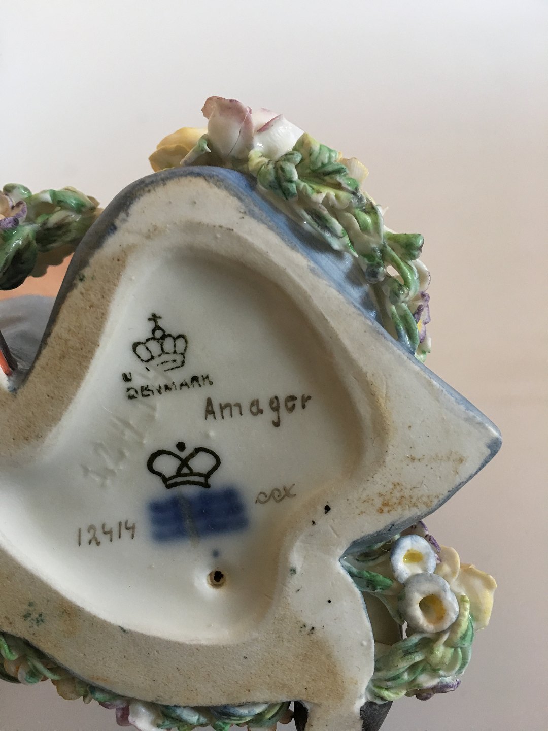 Royal Copenhagen overglaze figurine Amager Boy No 12414. Measures 15cm and has minimal chips on flowers.