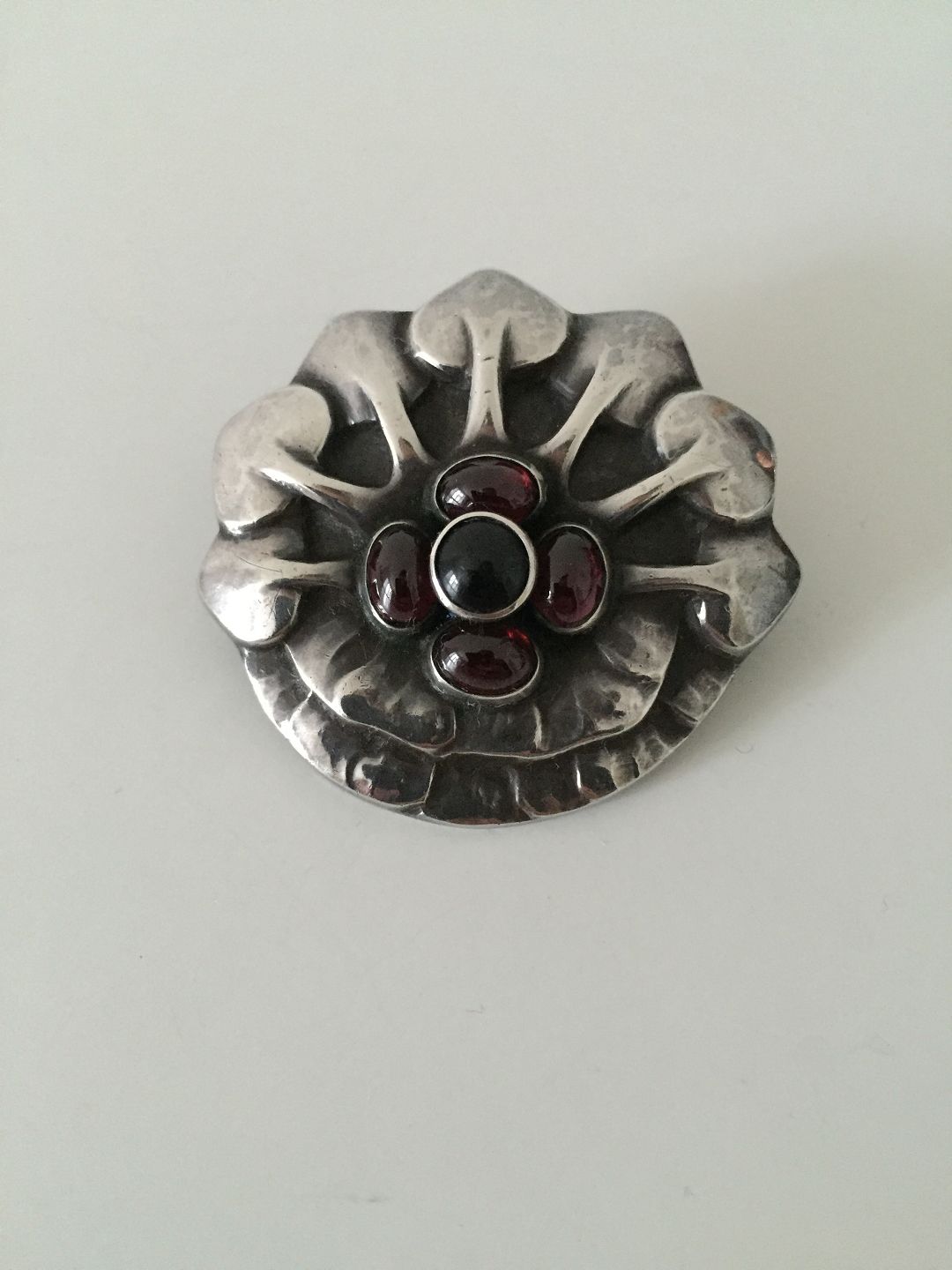 Georg Jensen Early Brooch with stones from 1904-1908. Measures 4,2cm (1 21/32") and is in good condition. But one stone with crack. Weighs 14g / 0,50oz.