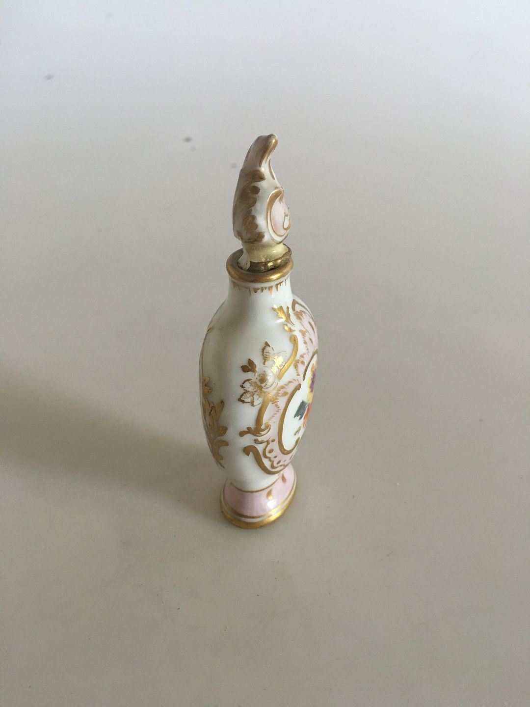 Royal Copenhagen Saxon Flower Flacon with lid approx. 1860. Measures 10 cm. Lid with chip and repair.