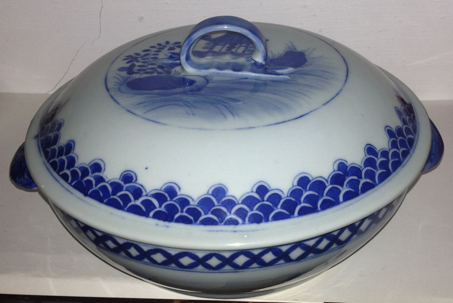 Royal Copenhagen China Lidded Bowl made in China. Measures 24cm and is in good condition. Very rare piece of test porcelain that RC had made in China, as they wanted to move production to China back 80-90 years ago. It was never a success as the quality and decoration is fare from what we know as RC porcelain.