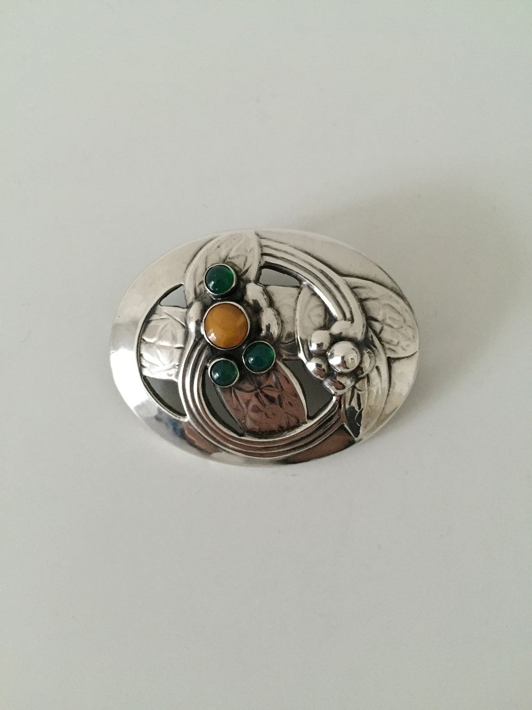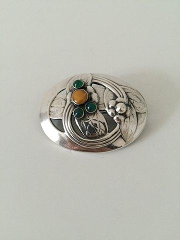 Georg Jensen Silver Brooch with Ambor and Green stones No 13. From 1904-1914. Measures 5 cm / 1 31/32 in. x 3.9 cm / 1 17/32 in. Weighs 11 g / 0.35 oz.