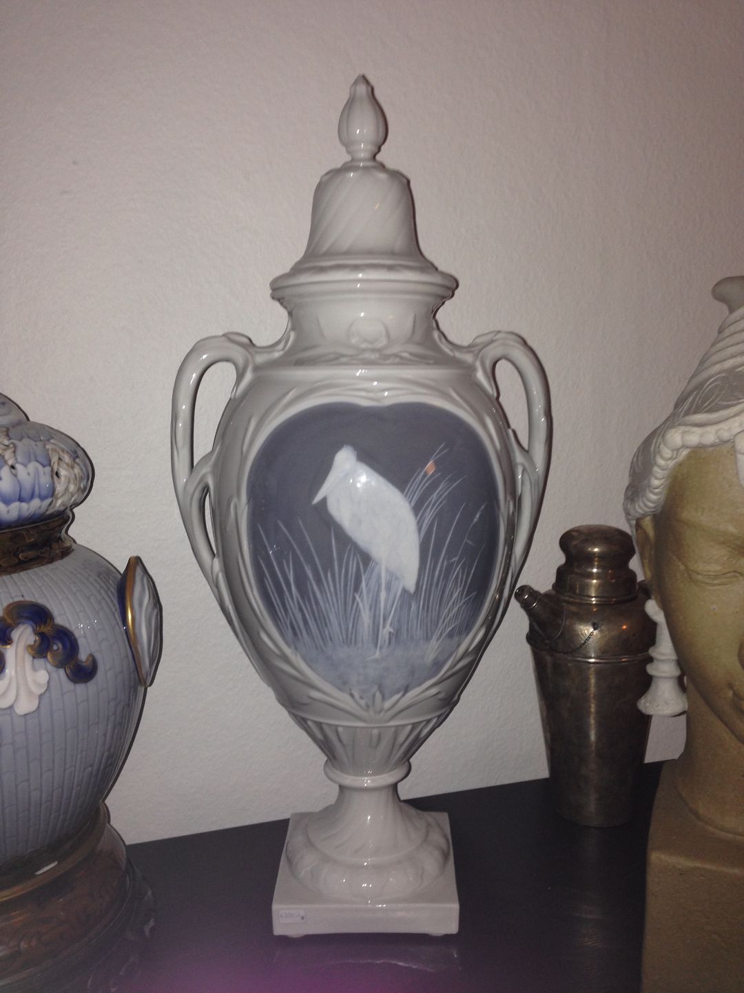 Rorstrand Art Nouveau Pate sur plate vase with Heron and Flowers. Measures 59cm high and is in good condition.