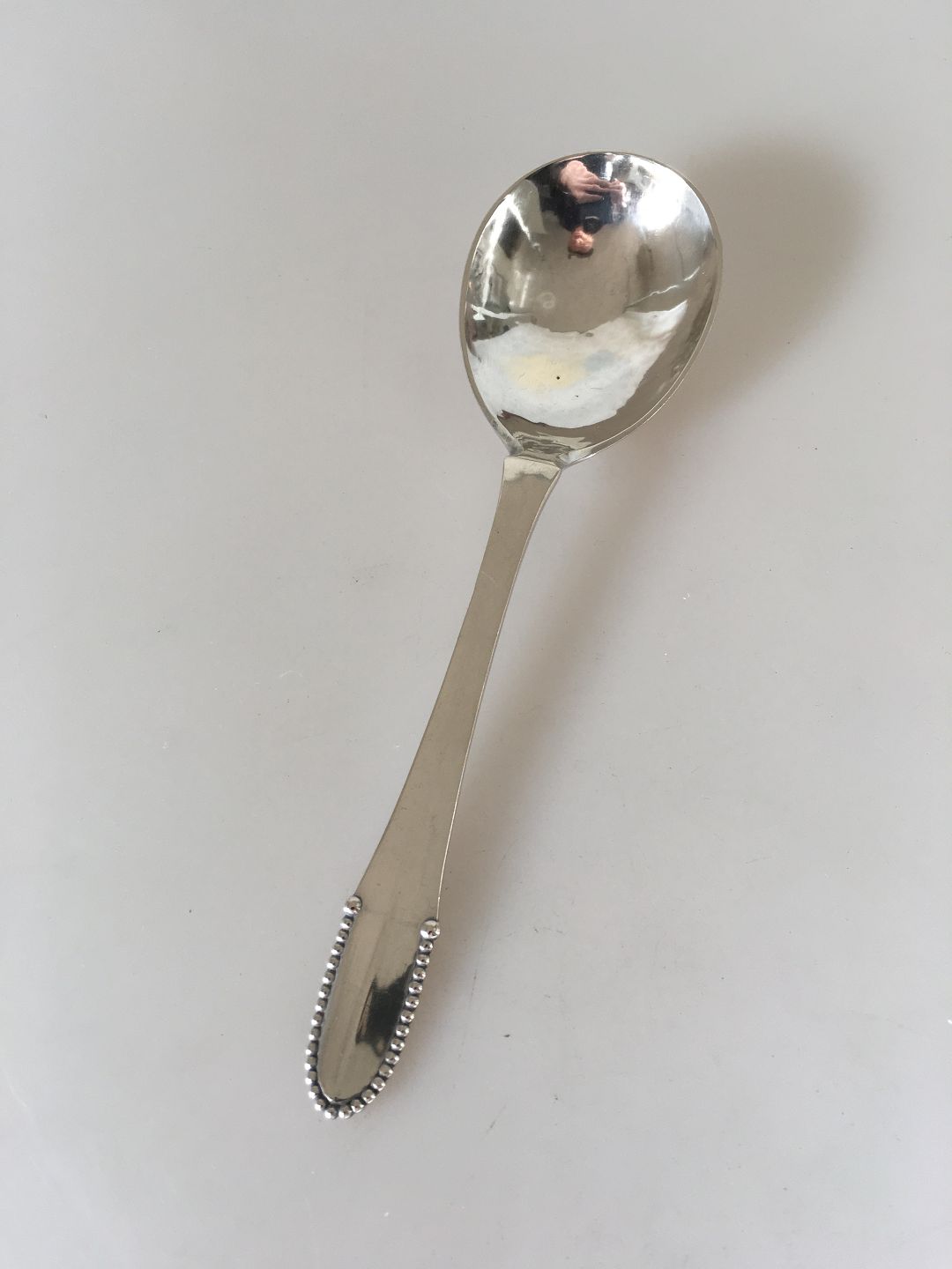 Georg Jensen Sterling Silver Beaded Compote Spoon No 161. Measures 16.7 cm / 6 37/64". Design Georg Jensen 1916.