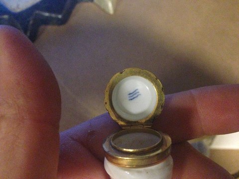Royal Copenhagen Lady leg needle holder. Marked with the 3 waves in the lid. Dates to 1780-1800. In perfect condition and lid is firm. Measures 4 1/4" or 10,8cm