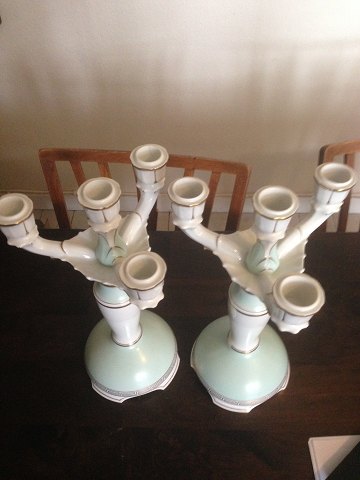Bing & Grondahl Pair of 4-Arm Candelabra's in mint green and with gold. Measures 38,5cm and is in perfect condition.
