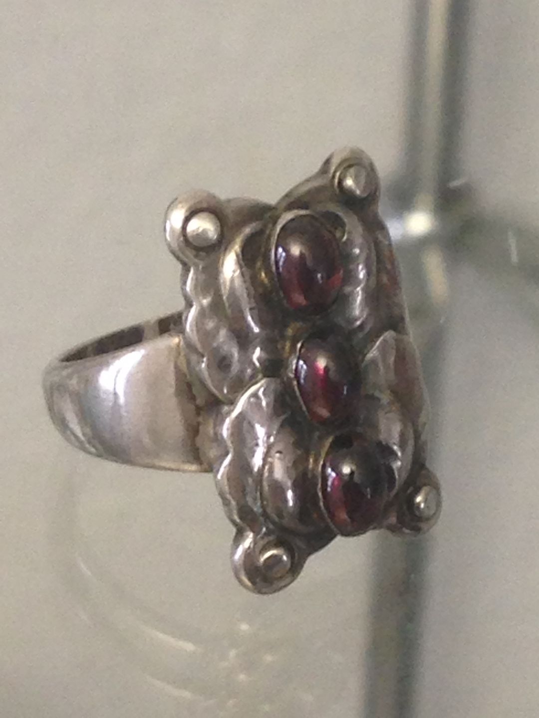 Georg Jensen Sterling Silver ring with Granat stones. In perfect condition. Ring size is 58.