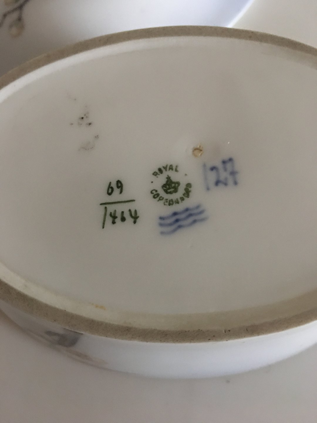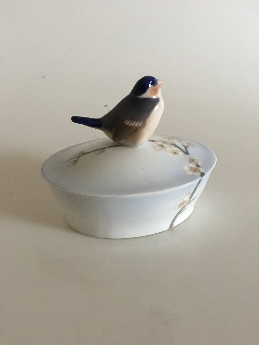 Royal Copenhagen Art Nouveau Lidded dish with bird No 64/1464. Measures 13,7cm and is in perfect condition.