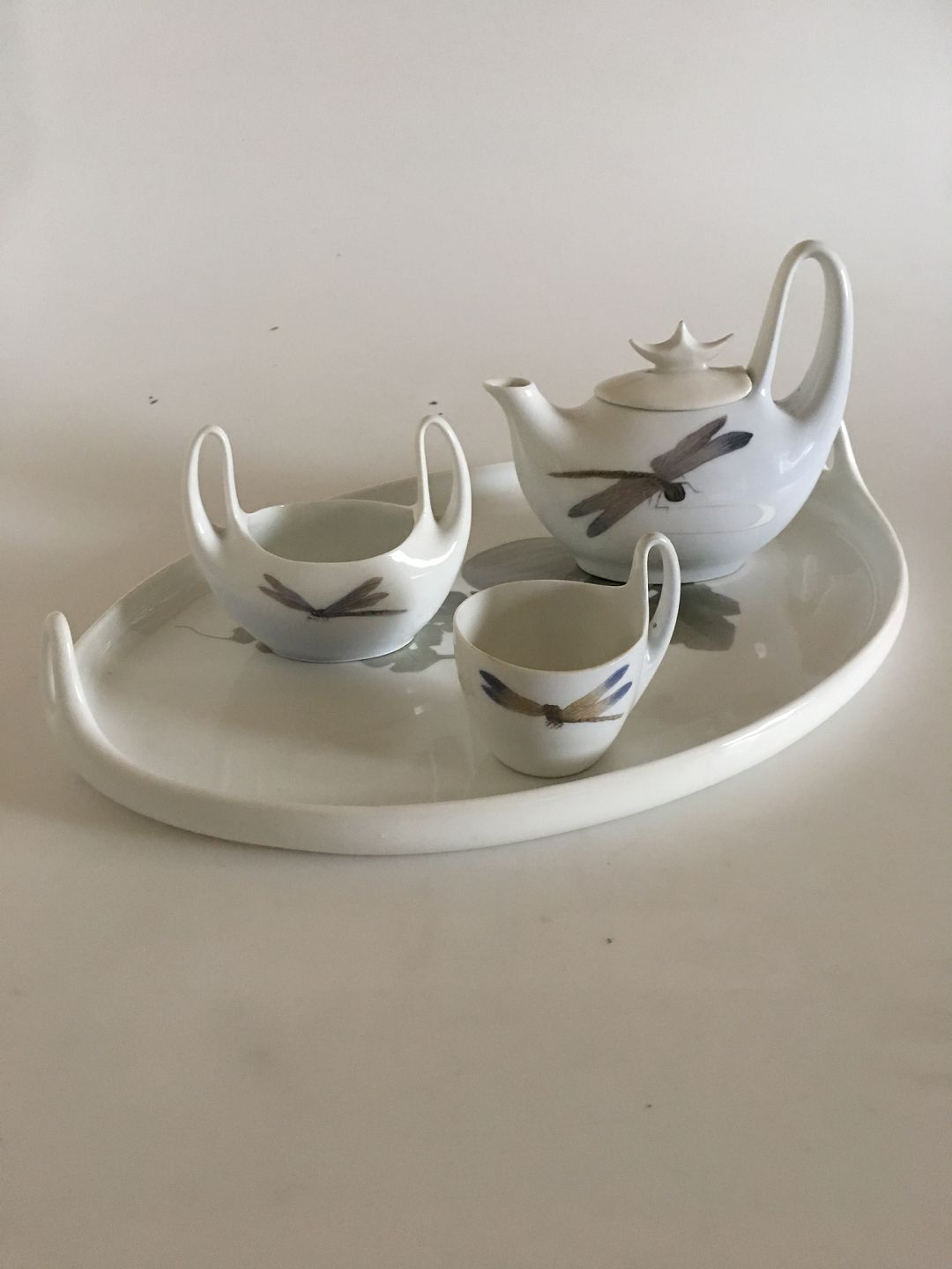 Very Rare Royal Copenhagen Art Nouveau Coffee Set with Pot, Cup, Sugar Bowl and Tray No 4 with Dragonflies.