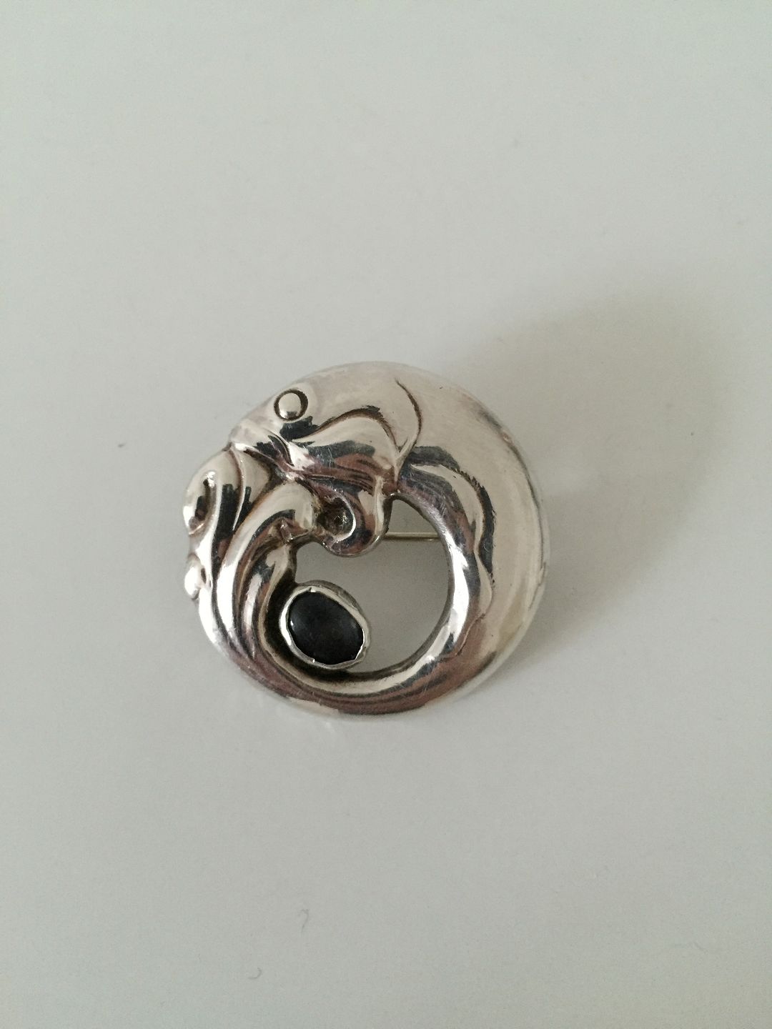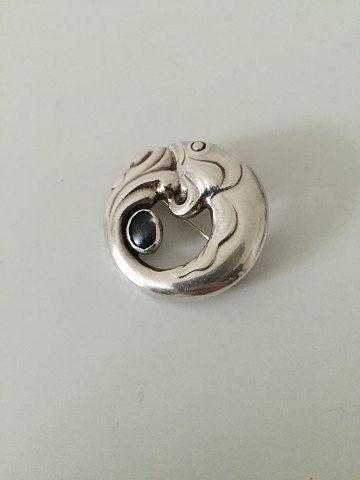 Early Georg Jensen Silver Brooch with fish motif and moonstone No 10. Measures 3,2cm (1 17/64"). Weighs 7g / 0,25oz