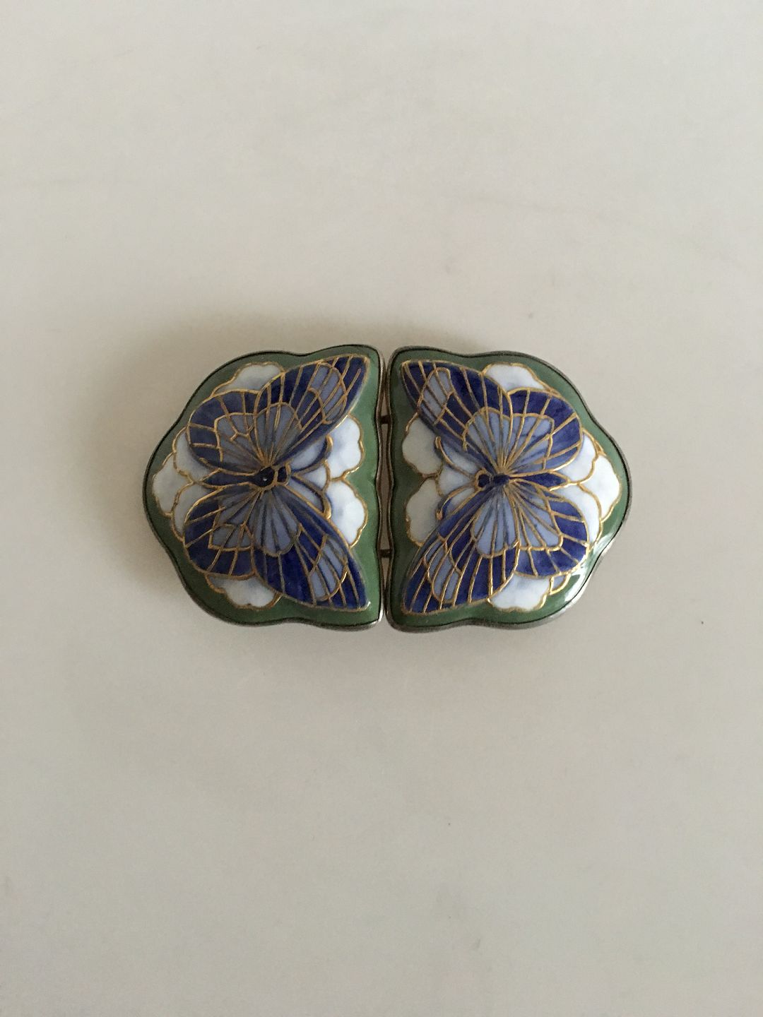 Royal Copenhagen Anton Michelsen Belt Buckle No 336 by Christian Thomsen and is from 1906. Gilded inlayed silver. In good condition, except for a hairline in one corner. Can be seen on the picture. Motif is butterflies. Measures 10.2 cm / 4 1/64 in. x 6 cm / 2 23/64 in.