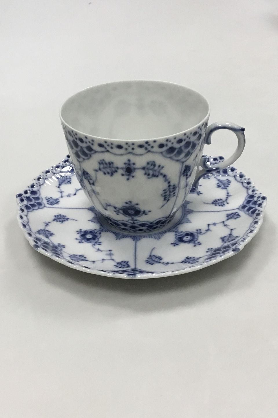 Royal Copenhagen Blue Fluted Full Lace Coffee Cup and Saucer No. 1035. Cup measures 6.5 cm (2 9/16") and saucer 13.7 cm (5 25/64").